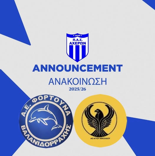 Ο ΠΑΣ Αχέρων συγχαίρει το φίλο σωματείο ΑΟ ΦΟΡΤΟΥΝΑ ΒΑΛΑΝΙΔΟΡΑΧΗΣ για την πανάξια και αδιαμφισβήτητη άνοδο του στην 𝐀´ ΕΠΣ Πρέβεζας-Λευκάδας, καθώς...