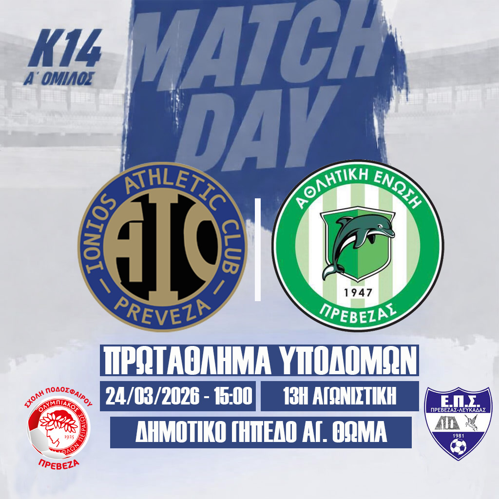 Δύο ενδιαφέρουσες αναμετρήσεις περιλαμβάνει το πρόγραμμα της Τρίτης για το πρωτάθλημα υποδομών Κ14 της ΕΠΣ Πρέβεζας–Λευκάδας, με το Δημοτικό Γήπεδο Αγίου Θωμά στην Πρέβεζα να βρίσκεται στο επίκεντρο της δράσης.