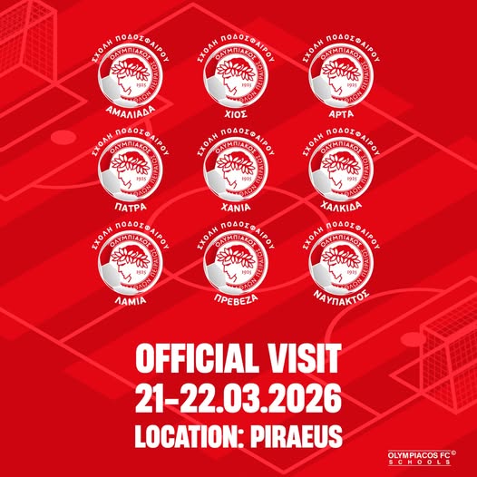 Ένα ξεχωριστό ποδοσφαιρικό Σαββατοκύριακο ετοιμάζεται να ζήσει το ελληνικό ποδόσφαιρο στις 21 και 22 Μαρτίου, με τις κεντρικές σχολές ακαδημιών του Ολυμπιακός να φιλοξενούν εννέα σχολές από την περιφέρεια σε ένα διήμερο γεμάτο δράση, εμπειρίες και αγωνιστικές στιγμές.