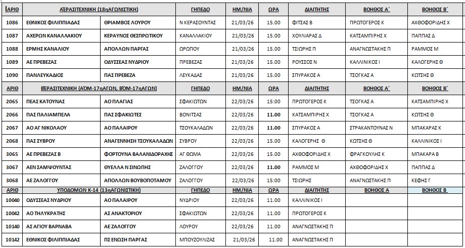 ΑΕ Πρέβεζας Β’ – Φορτούνα Βαλανιδοράχης (15:00): Αχθοφορίδης Χ. (Φραγκούλης Κ., Μπακαρά Β.)