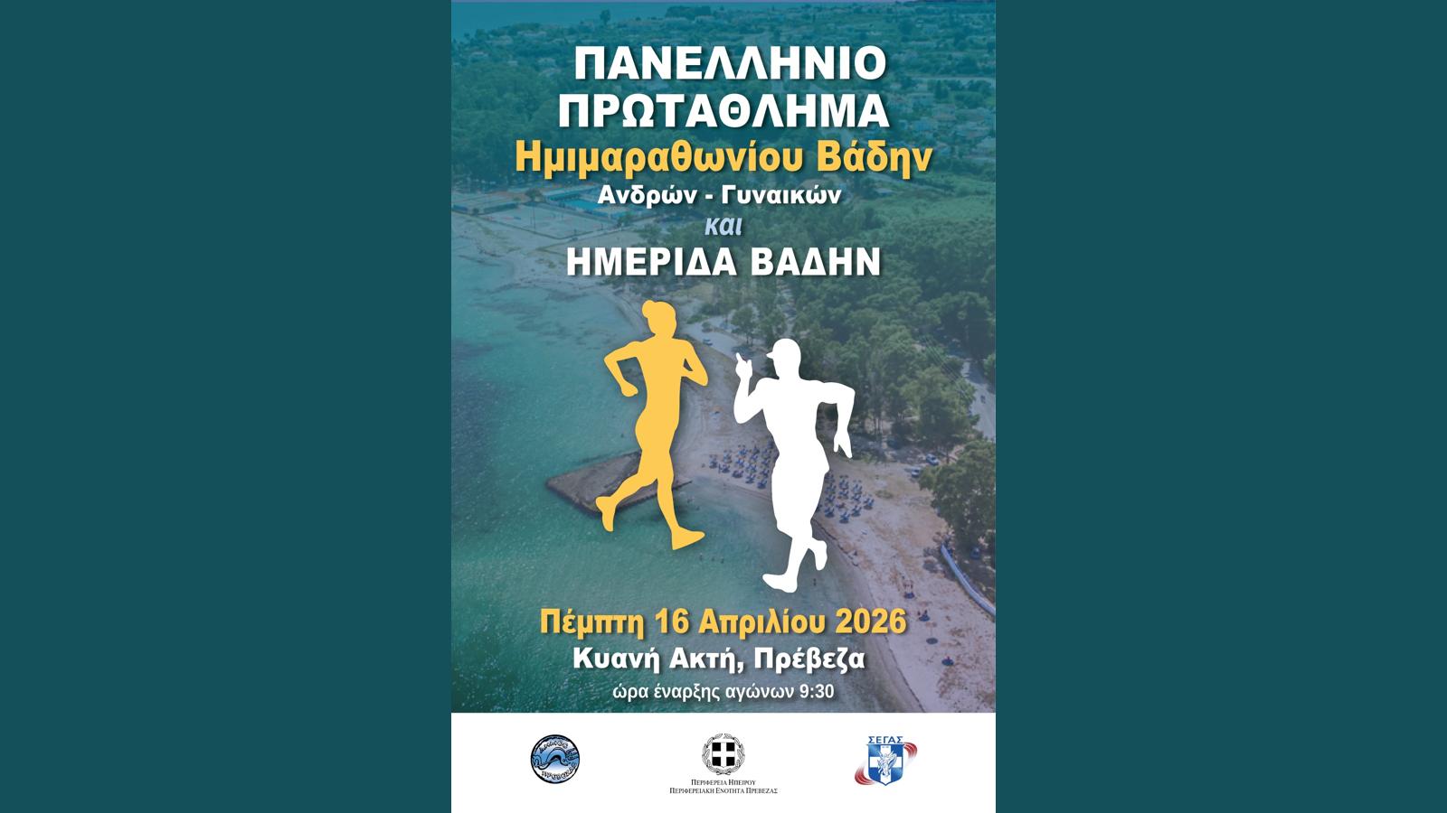 Ο Δήμος Πρέβεζας ανακοινώνει με ιδιαίτερη χαρά τη διοργάνωση του Πανελληνίου Πρωταθλήματος Ημιμαραθωνίου Βάδην Ανδρών – Γυναικών & Κ23, το οποίο θα πραγματοποιηθεί την Πέμπτη 16 Απριλίου 2026, στην πόλη της Πρέβεζας, σε συνεργασία με τον ΣΕΓΑΣ, την ΕΑΣ ΣΕΓΑΣ Ηπείρου και την Περιφερειακή Ενότητα Πρέβεζας