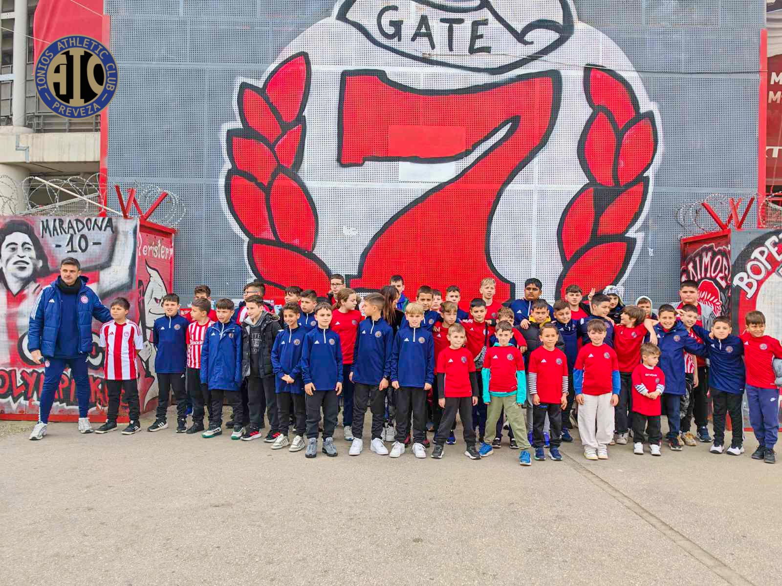 Το απόγευμα της ίδιας ημέρας, οι αθλητές και οι συνοδοί παρακολούθησαν από κοντά τον αγώνα πρωταθλήματος ανάμεσα στον Ολυμπιακό και τη Λάρισα, ζώντας την ένταση και την ατμόσφαιρα ενός αγώνα υψηλού επιπέδου. Μάλιστα, ξεχωριστή στιγμή αποτέλεσε η συμμετοχή δύο αθλητών του IONIOS AC, οι οποίοι συνόδευσαν τους ποδοσφαιριστές κατά την είσοδό τους στον αγωνιστικό χώρο, σε μια εμπειρία που θα τους μείνει αξέχαστη.
