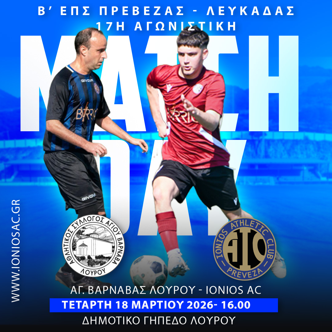 Ένα ιδιαίτερα ενδιαφέρον παιχνίδι περιλαμβάνει το πρόγραμμα της 17ης αγωνιστικής της Β’ κατηγορίας της ΕΠΣ Πρέβεζας – Λευκάδας, με τον IONIOS AC να αντιμετωπίζει εκτός έδρας τον Αγ. Βαρνάβα Λούρου στο Δημοτικό Γήπεδο Λούρου.