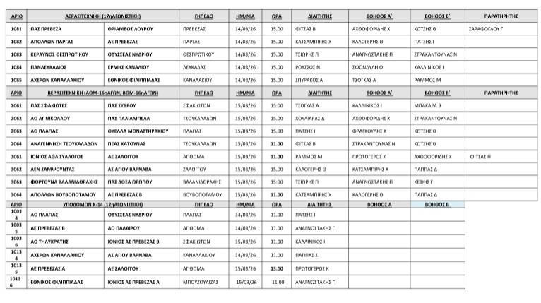 Οι αναμετρήσεις θα διεξαχθούν το Σαββατοκύριακο 14 και 15 Μαρτίου σε γήπεδα της Πρέβεζας, της Λευκάδας και της ευρύτερης περιοχής, με τους διαιτητές και τους βοηθούς τους να έχουν ήδη οριστεί από την αρμόδια επιτροπή διαιτησίας της Ένωσης.