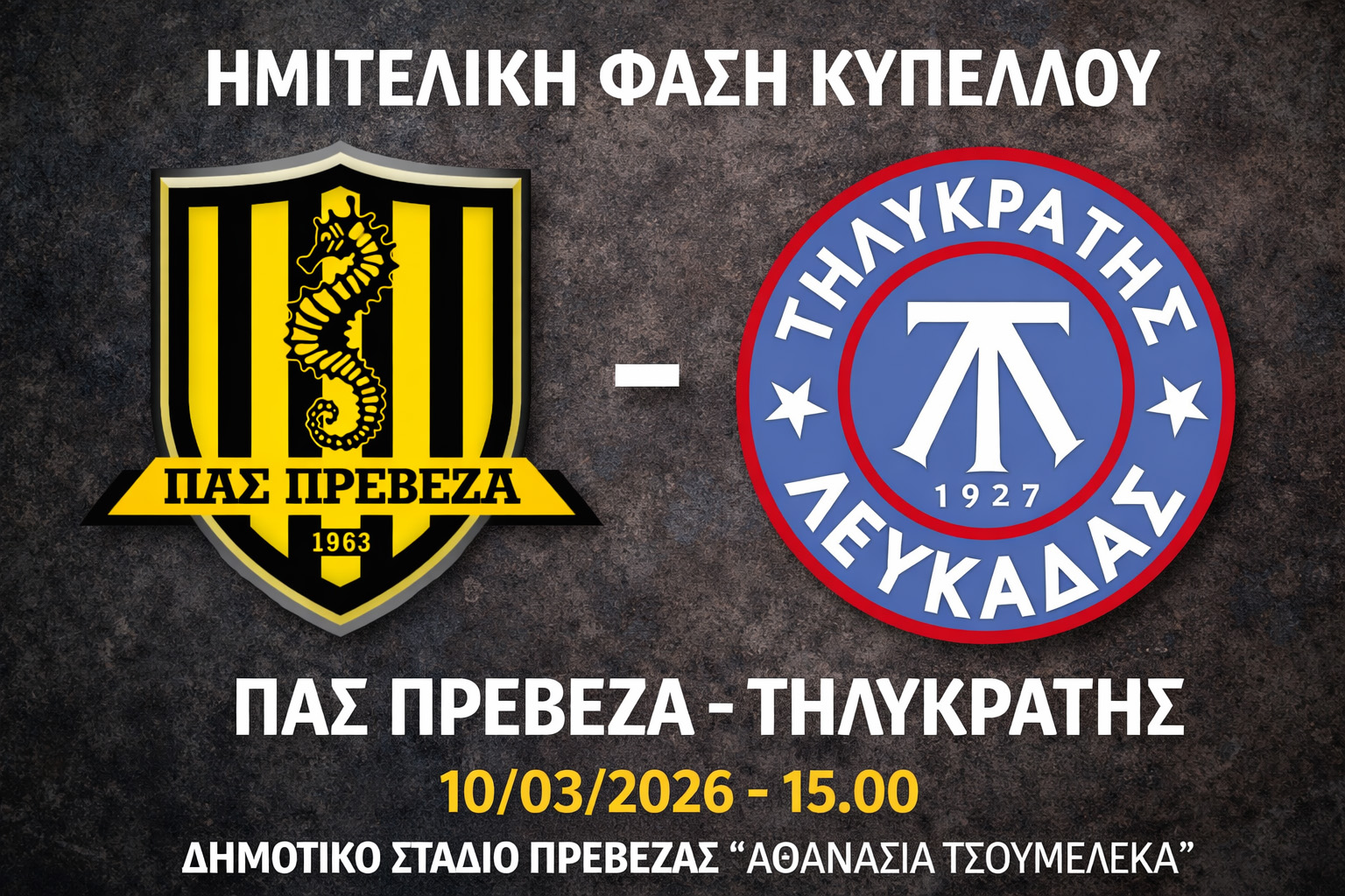 Ο ΠΑΣ Πρέβεζα υποδέχεται την Τρίτη 10 Μαρτίου 2026 και ώρα 15:00, στο Δημοτικό Στάδιο Πρέβεζας «Αθανασία Τσουμελέκα», τον Τηλυκράτη Λευκάδας για την ημιτελική φάση του Κυπέλλου της ΕΠΣ Πρέβεζας – Λευκάδας, σε μια αναμέτρηση που αναμένεται με ιδιαίτερο ενδιαφέρον από τους φίλους του ποδοσφαίρου της περιοχής.